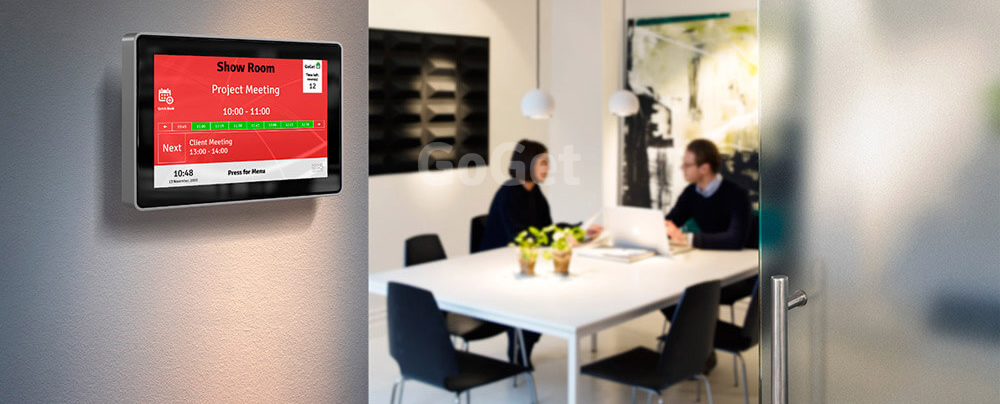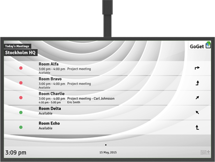 El nuevo Room Finder de Room Display 5 es una solución profesional, moderna y rentable ideal para oficinas con varias salas de reuniones. Muestra información de la sala con señales fáciles de leer para todos los asistentes a reuniones en los monitores de las áreas de recepción, vestíbulos y otras áreas de la oficina. Mejora y complementa el sistema GoGet Room Display.