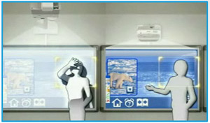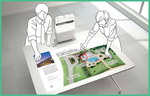 Proyecta sobre cualquier superficie horizontal, permitiendo trabajar con documentos o archivos multimedia sobre una mesa, de forma participativa, consiguiendo que los trabajos en grupo y las actividades en el aula sean más interesantes
