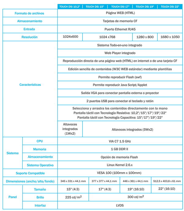 • Pantalla táctil conTecnología Capacitiva: 15"/17"/19"/22"