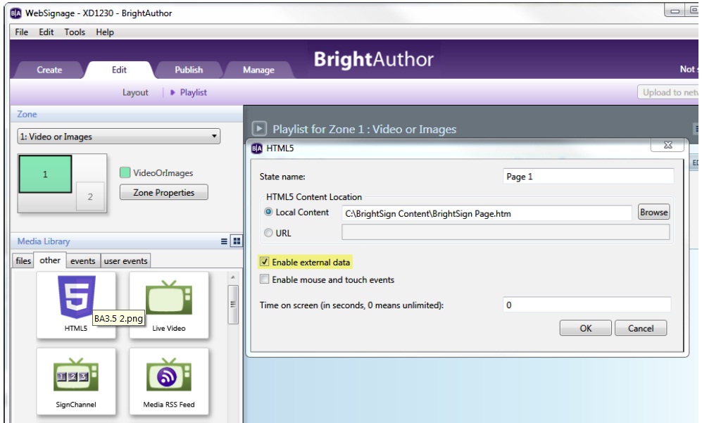 ![]() Optimización de contenido HTML5 para los reproductores BrightSign 1. A menudo es deseable ocultar las barras de scroll de una página web cuando se muestre en cartelería digital. Se pueden añadir las siguientes líneas al código CSS para ocultar las barras de scroll: ::-webkit-scrollbar { 2. Cuando el reproductor BrightSign cargue el contenido HTML desde una URL, puede haber un retraso introducido por la latencia de la red. Se puede añadir una imagen precargada para solventar este problema: a. Arrastre un fichero de imagen desde su librería. ![]() |