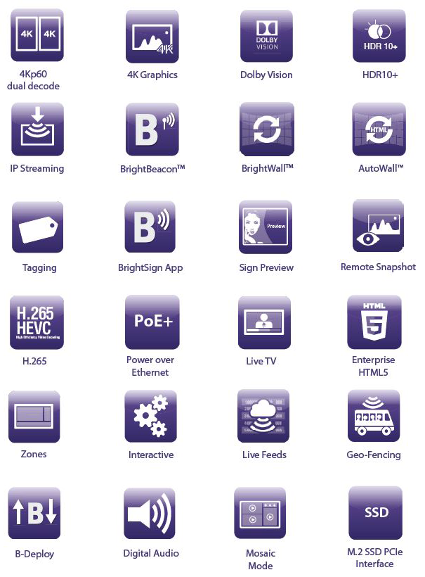 Gama compacta, económica y con las prestaciones principales. Dispositivos de categoria industrial de máxima fiabilidad con H265 Full HD decodifición y reproducción. HTML5, USB 2.0 tipo C y capacidades de red. Todo ello en la plataforma Brightsign de probada solvencia técnica.
