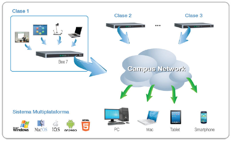 Permite streaming en directo o reproducciones bajo demanda de las clases. Se puede acceder a los contenidos de de cualquier terminal.