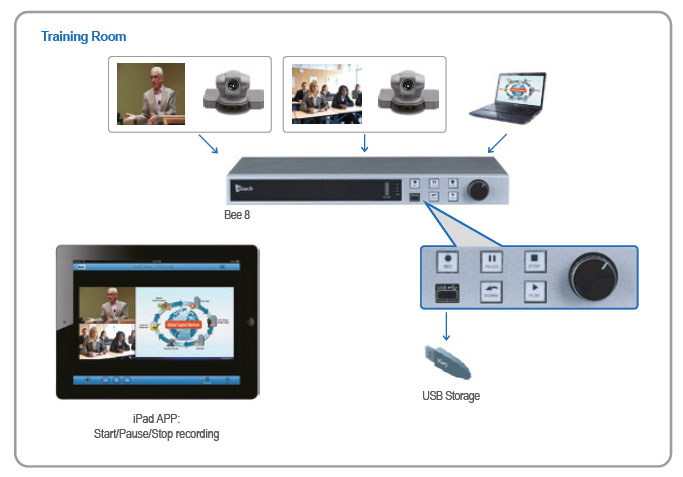 El sistema de captura de clases para formación Bee8 se utiliza para grabar y compartir vídeos de clases o de formación. Es compatible con la grabación simultánea, en vivo, con señales de vídeo bajo demanda y señales de presentación. El sistema de captura de clases es muy fácil de usar, lo que premite a los usuarios contruir rápidamente una plataforma para compartir sus propios vídeos. Un disco duro interno asegura el contenido, al mismo tiempo que permite el acceso inmediato y la portabilidad a un dispositivo USB. Esta solución es adecuada para una amplia variedad de aplicaciones y eventos en vivo.