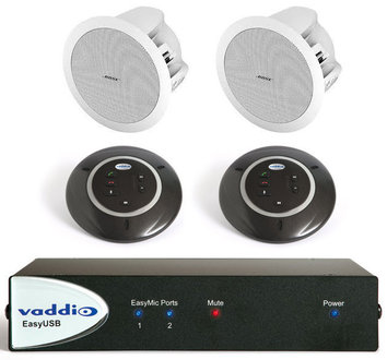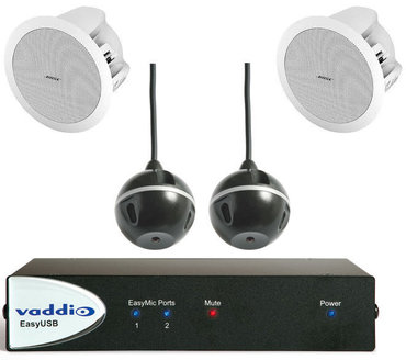 Solución para vídeo conferencia mediante interface USB utilizando aplicaciones para PC que requieran de instalación de micrófonos en el techo de la sala. Incluye los equipos necesarios para diseñar una sala de vídeo conferencia de tamaño mediano: (1) EasyUSB Mixer/Amp. (2) EasyMic MicPODs blancos para techo con cancelación de eco. (2) Altavoces para techo Bose DS-16 con soporte de abrazadera y tapa posterior.